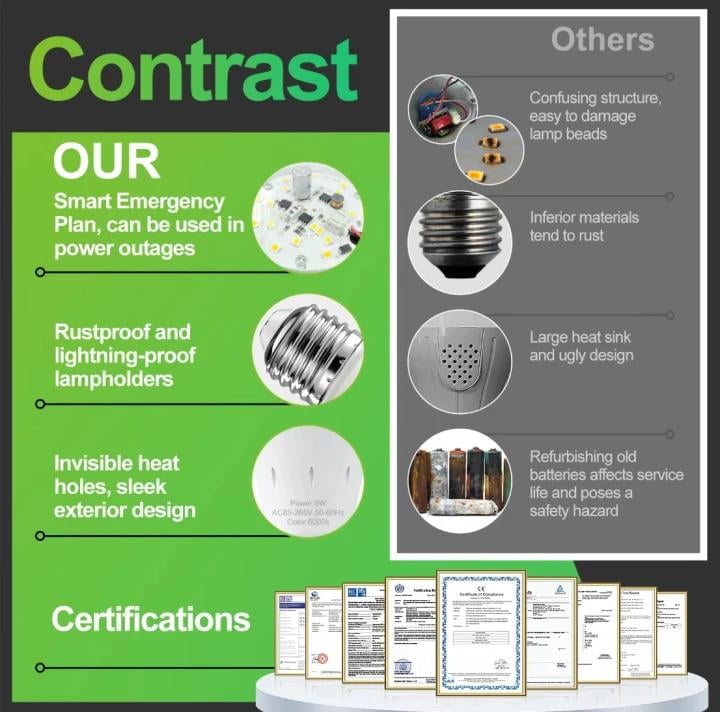 When power is interrupted, the bulb instantly switches to battery mode and delivers up to 5–6 hours of illumination, helping keep your home safe and functional.