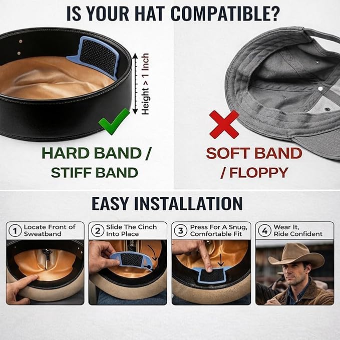 - Quick & Easy Application – Just insert the Hat Cinch in the front of your hat to create a secure, comfortable hold.